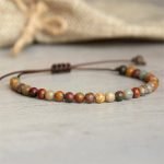 Picasso jasper bracelet with 4 mm genuine stone beads on a strong brown synthetic cord with a sliding macrame knot. Picasso Jasper is a lovely, happy stone that reminds us to celebrate and enjoy life, bringing optimism and openness. This brown jasper assists in the positive transformation of relationships.
